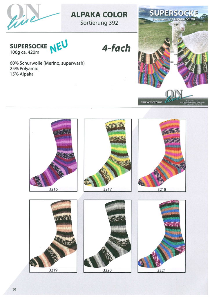 Alpaka Color-392 (4-fach) 6 x 1 kg 228-392 Sockpaket innehållande 1KG av vardera 6 färger60% Merino ull, 25% polyamid, 15% alpaka100g=420mStickor 2,5-3,0Beställnings vara Liknande produkter Sockpaket Amazonas Color-393 (4-fach) 8 x 1 kg 228-393 Sockpaket Step 6-Memory, 5 färger á 1,5 kg. 328-98946 Sockpaket Step 6-Paintbox, 5 färger á 1,5 kg. 328-98947 Sockpaket Step 4-Chalet, 6 färger á 1,0 kg. 328-98945 Sockpaket Merino Extrafein Color-395 (4-fach) 6 x 1 kg 228-395 Sockpaket Merino Color-396 (6-fach) 8 x 1,5 kg 228-396 Relaterade kategorier Online Strump/Raggsocksgarn Sockpaket Garner