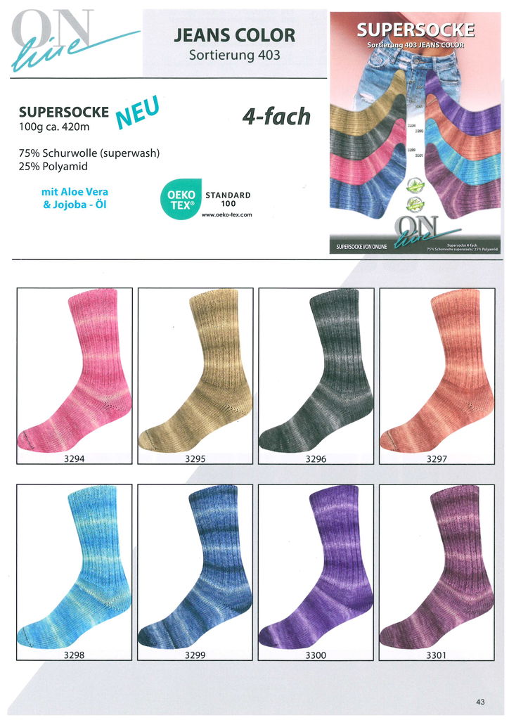 Jeans Color-403 (4-fach) 8 x 1 kg 228-403 Sockpaket innehållande 1KG av vardera 8 färger75% jungfru ull, 25% polyamid med Aloe Vera & Jojobaolja100g=420mStickor 2,5-3,0Beställnings vara Liknande produkter Sockpaket Alpaka Color-392 (4-fach) 6 x 1 kg 228-392 Sockpaket Step 6-Memory, 5 färger á 1,5 kg. 328-98946 Sockpaket Step 6-Paintbox, 5 färger á 1,5 kg. 328-98947 Sockpaket Step 4-Chalet, 6 färger á 1,0 kg. 328-98945 Sockpaket Amazonas Color-393 (4-fach) 8 x 1 kg 228-393 Sockpaket Merino Extrafein Color-395 (4-fach) 6 x 1 kg 228-395 Relaterade kategorier Online Strump/Raggsocksgarn Sockpaket GOTS/EXP/OEKO-TEX Garner